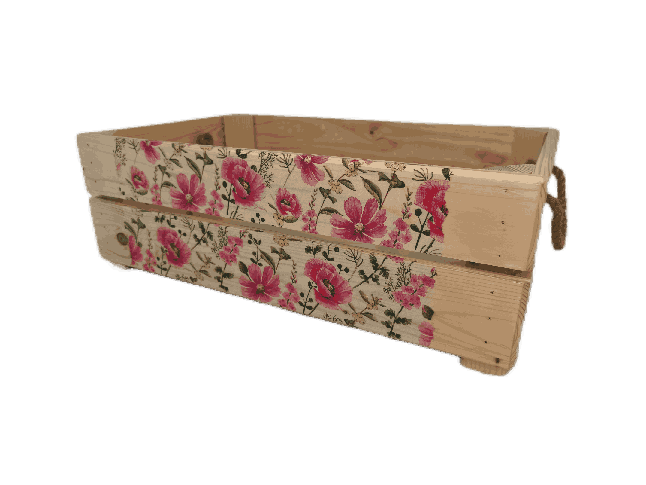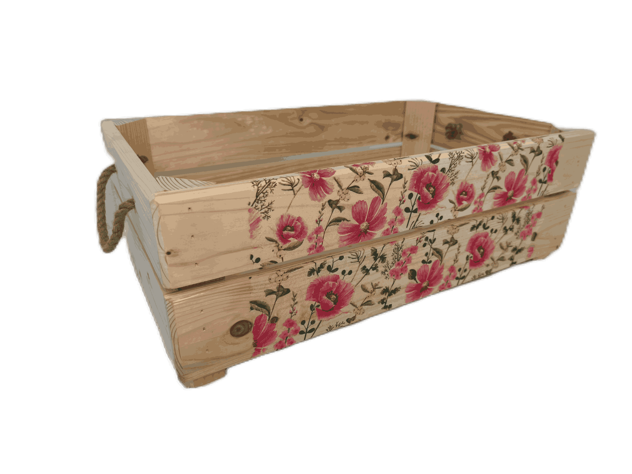 Povrchová úprava: opálené a broušené dřevo, obrázky metodou decupage