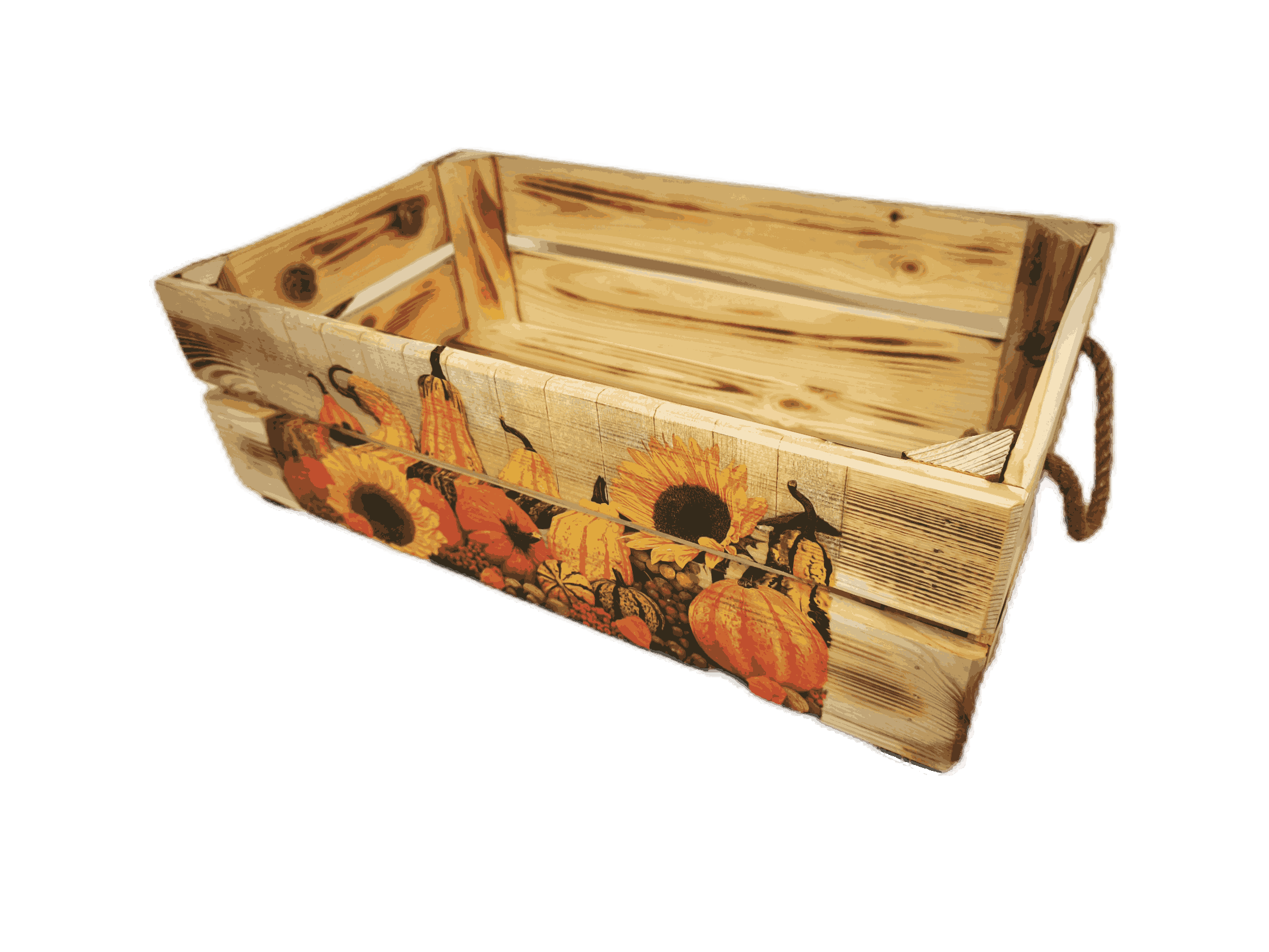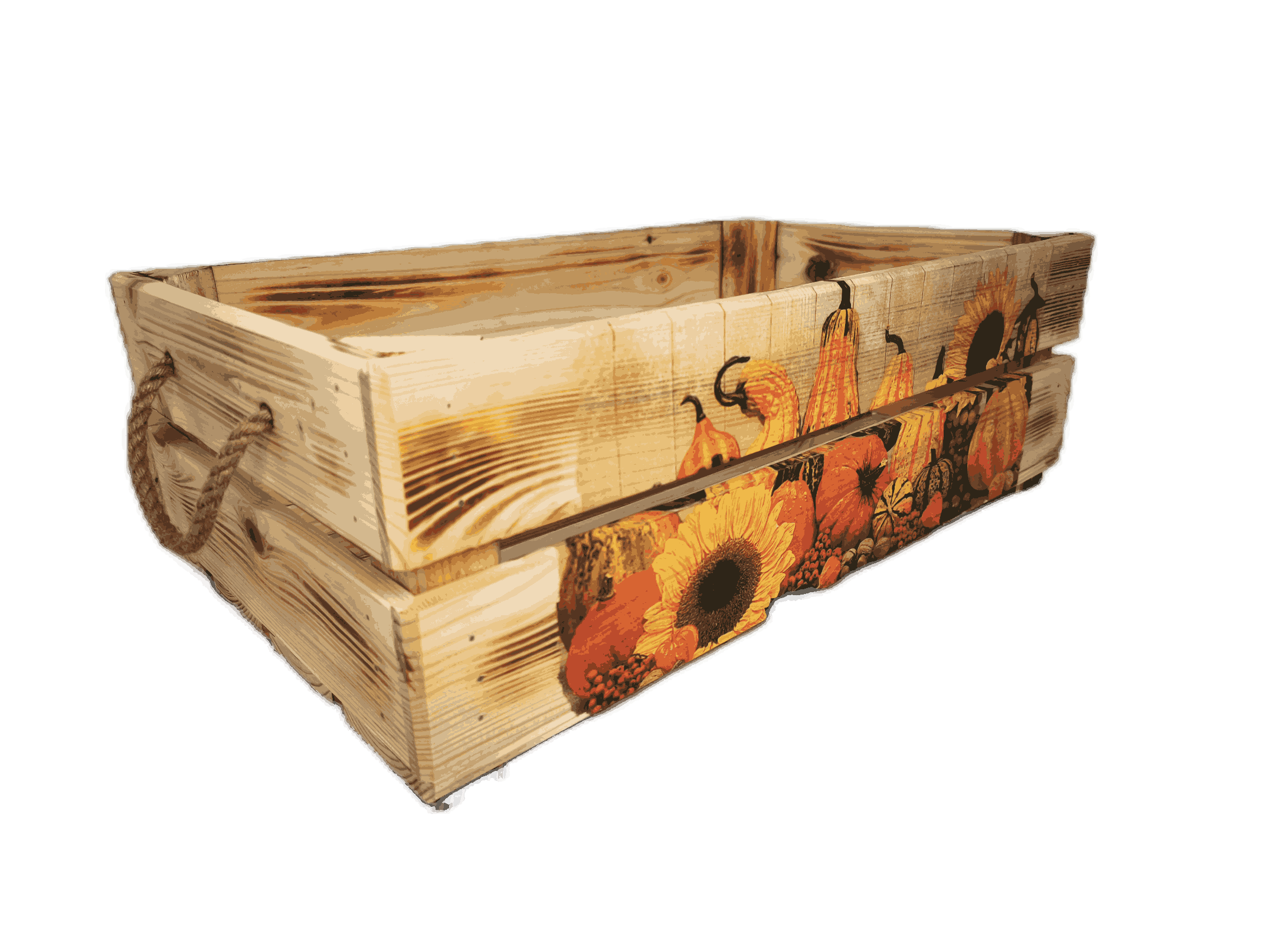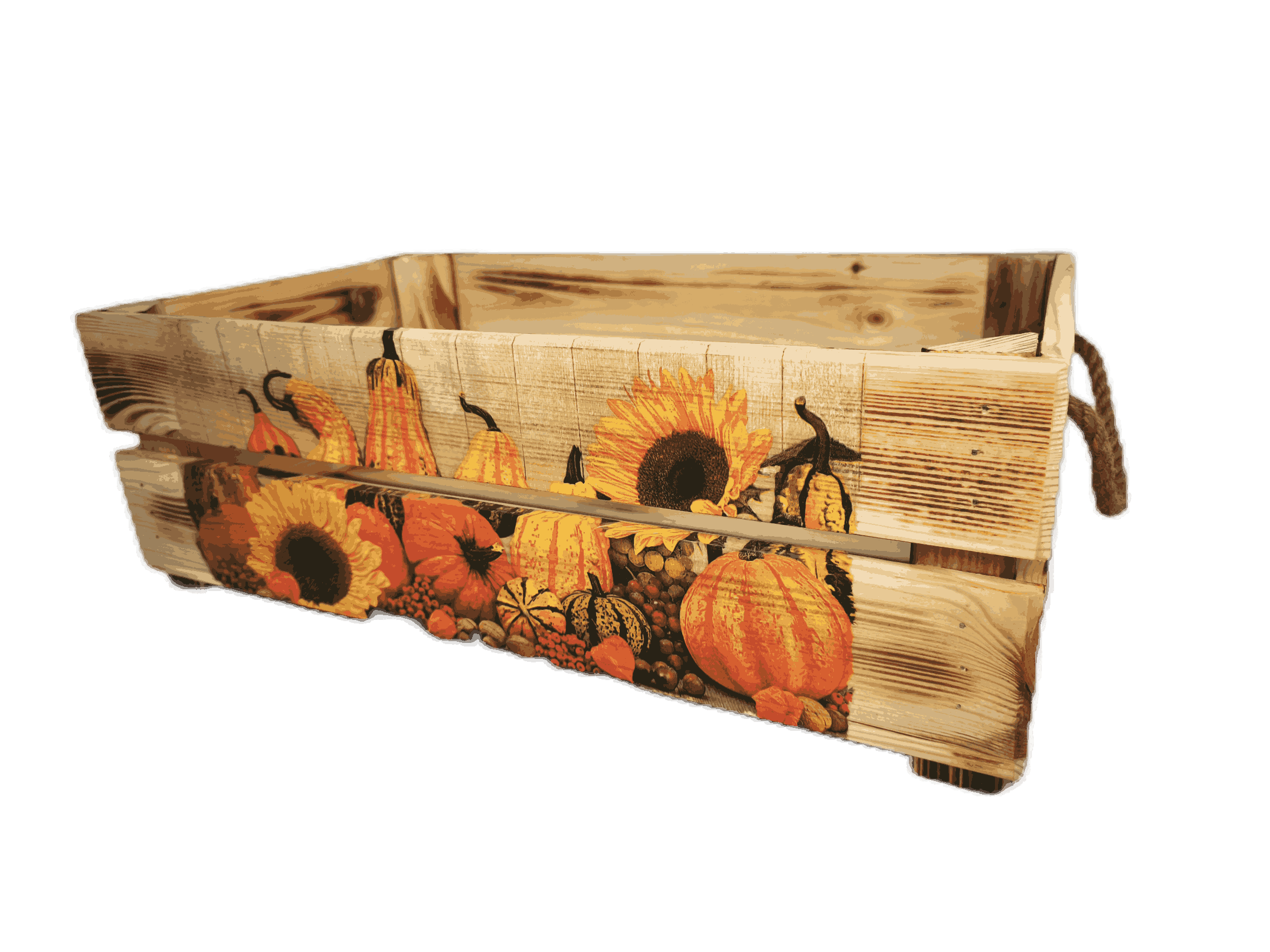 Povrchová úprava: opálené a broušené dřevo, obrázky metodou decupage