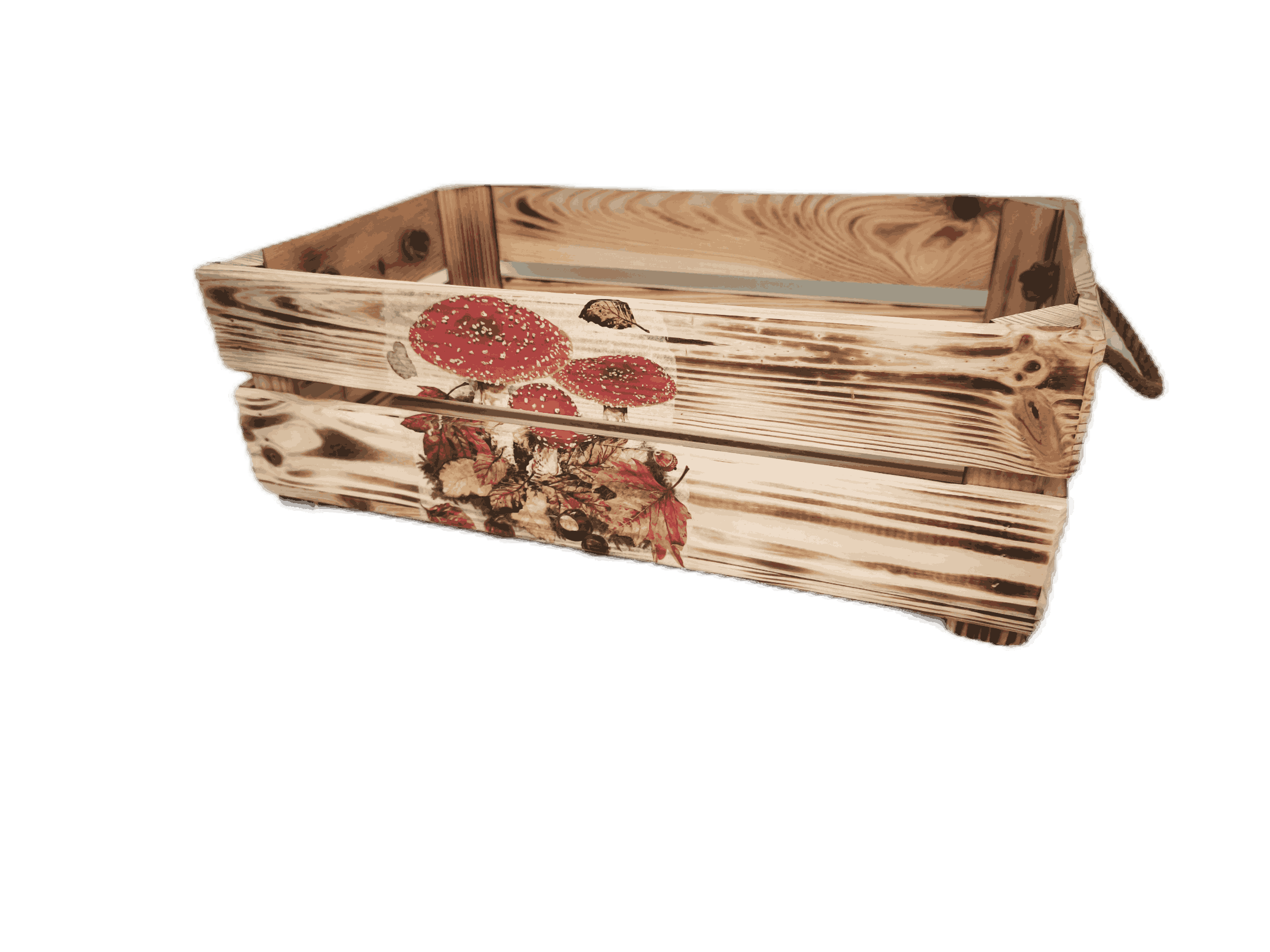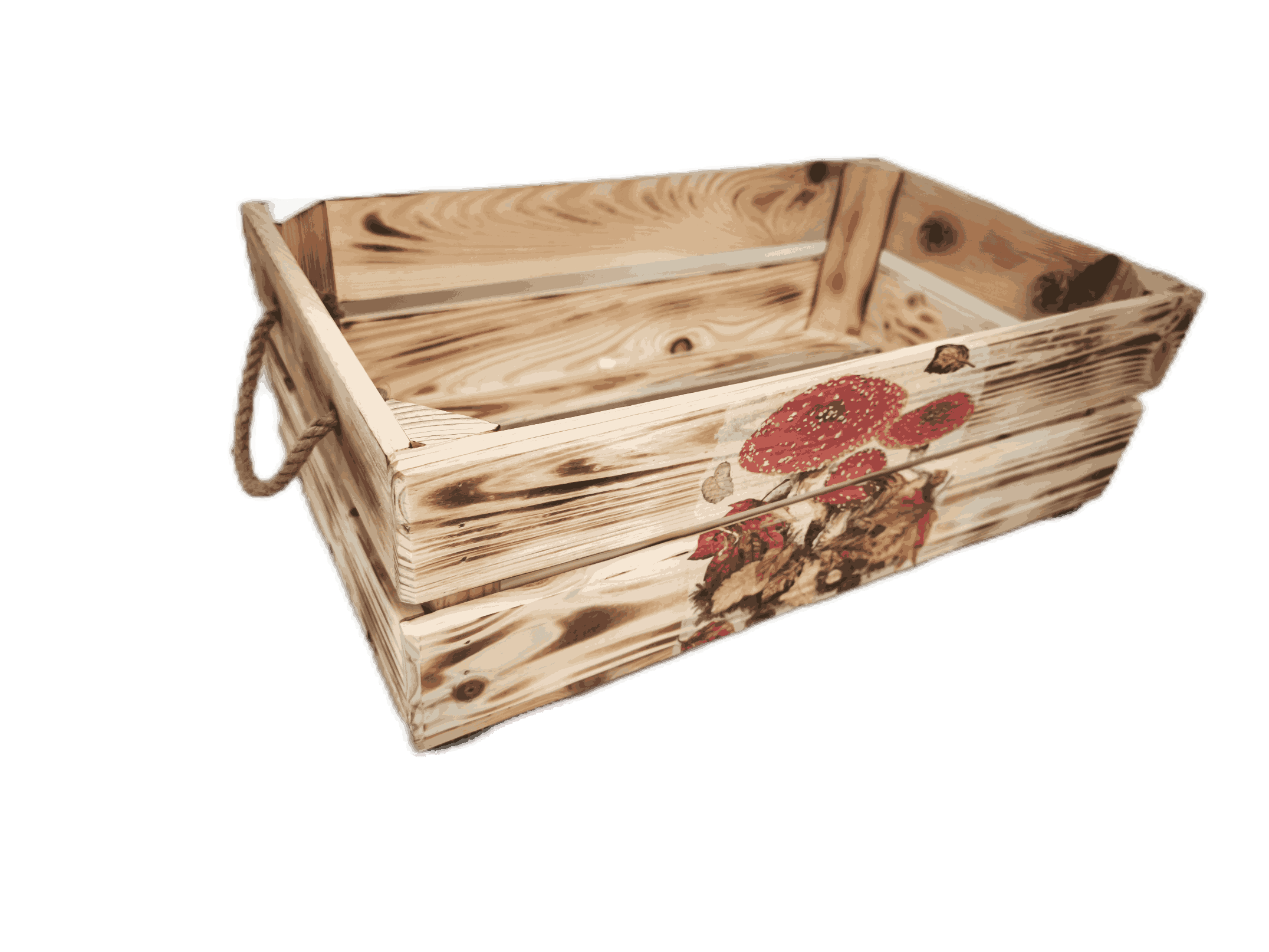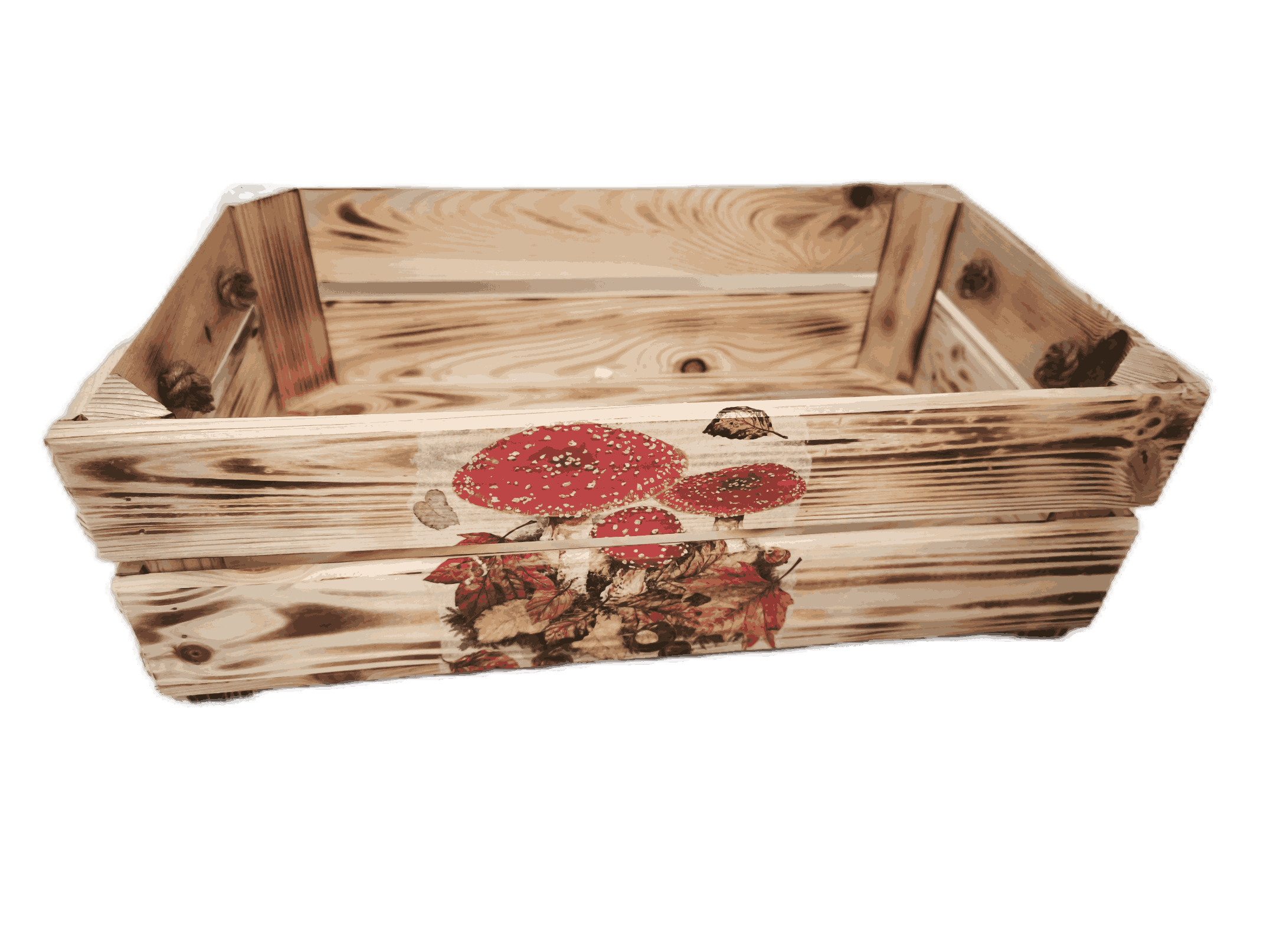 Povrchová úprava: opálené a broušené dřevo, obrázky metodou decupage