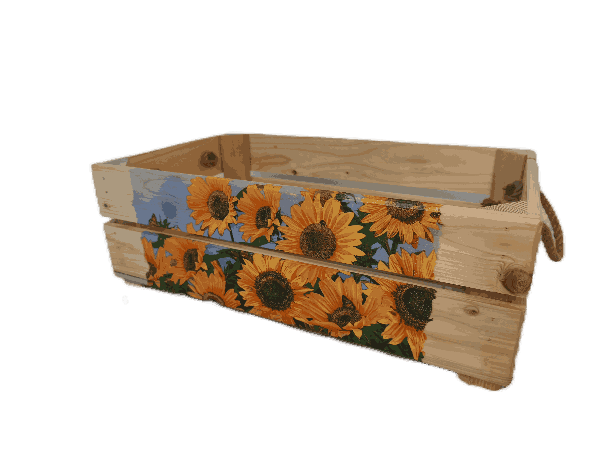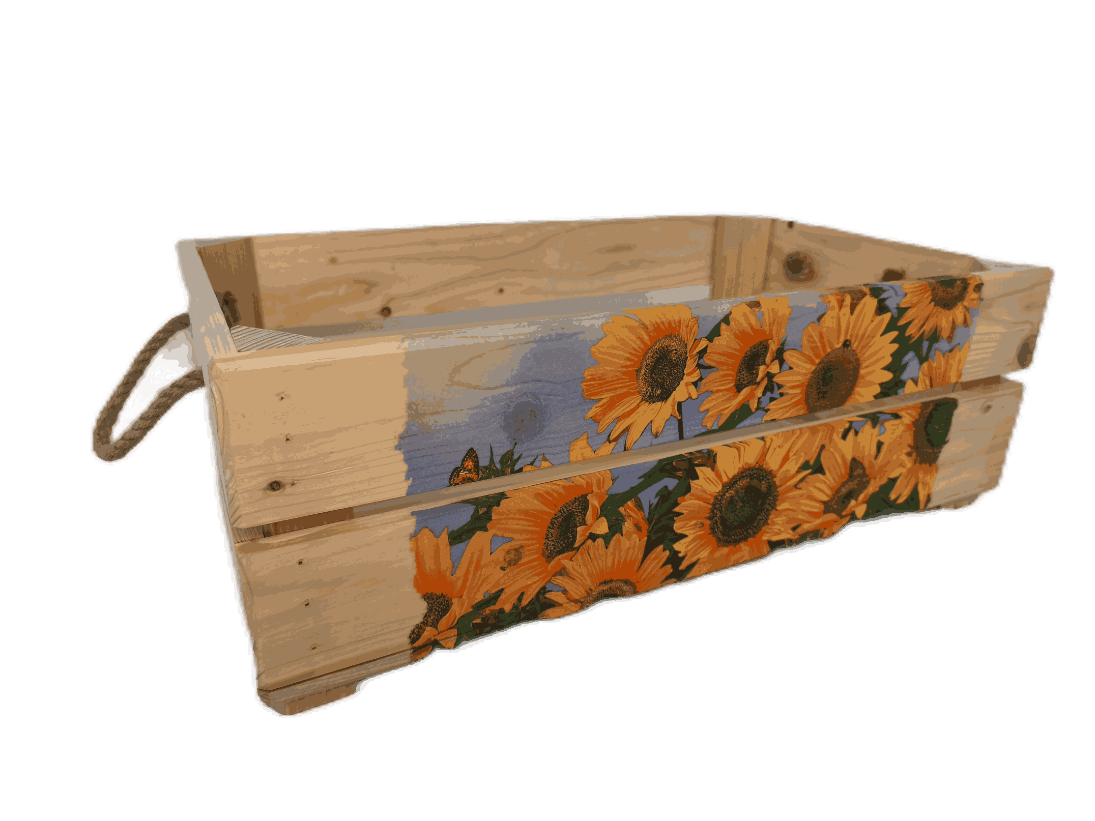 Povrchová úprava: opálené a broušené dřevo, obrázky metodou decupage