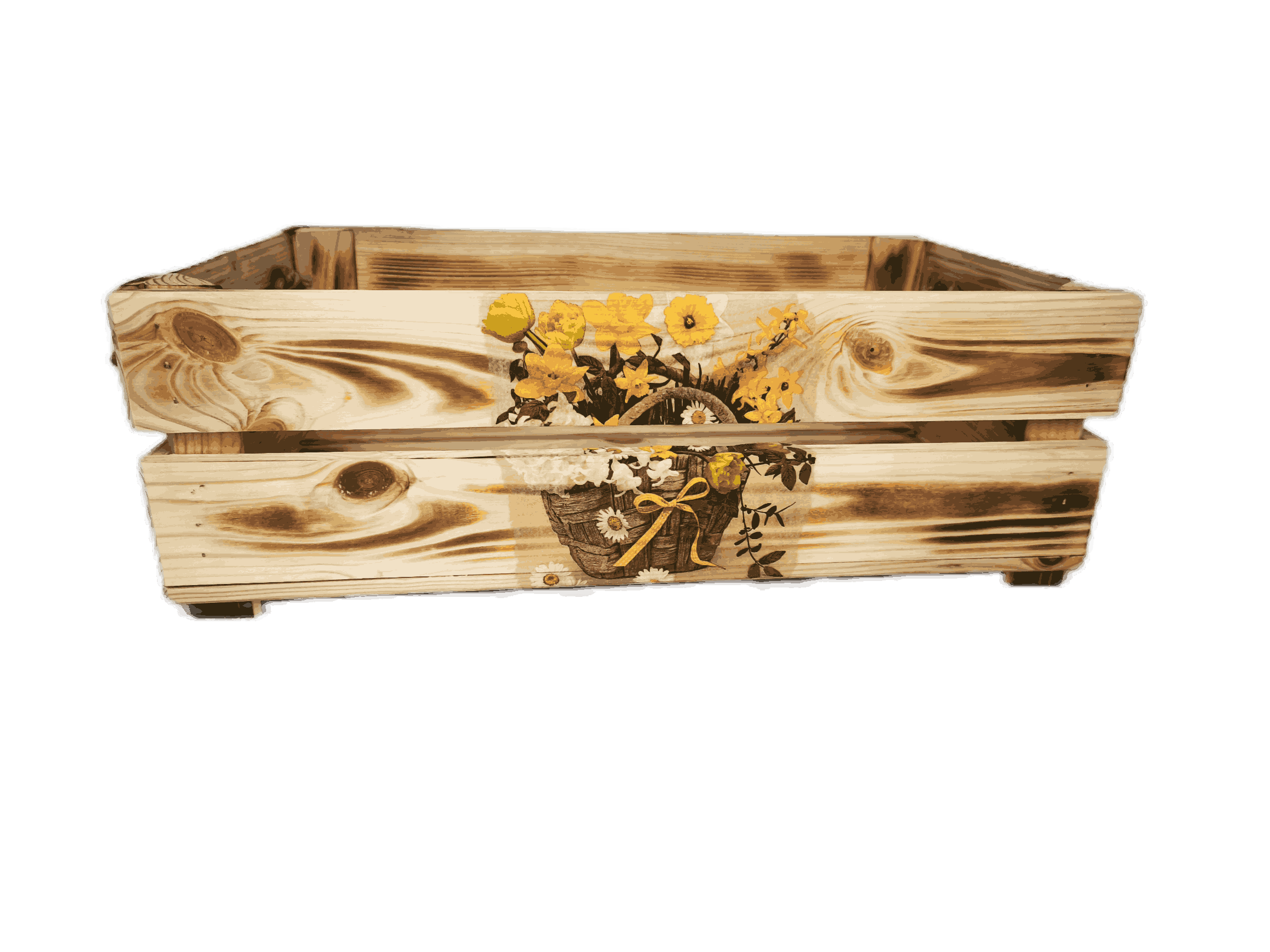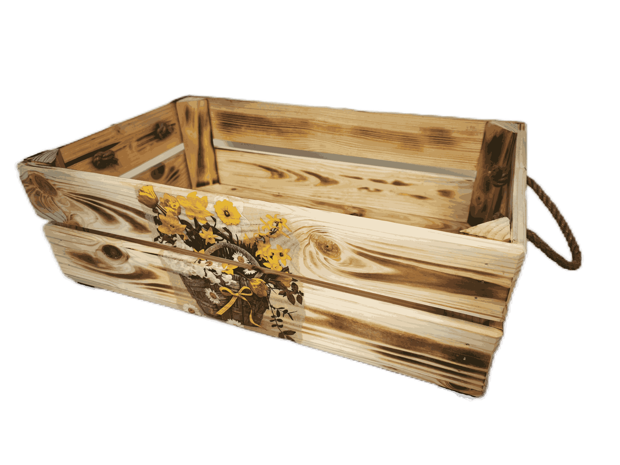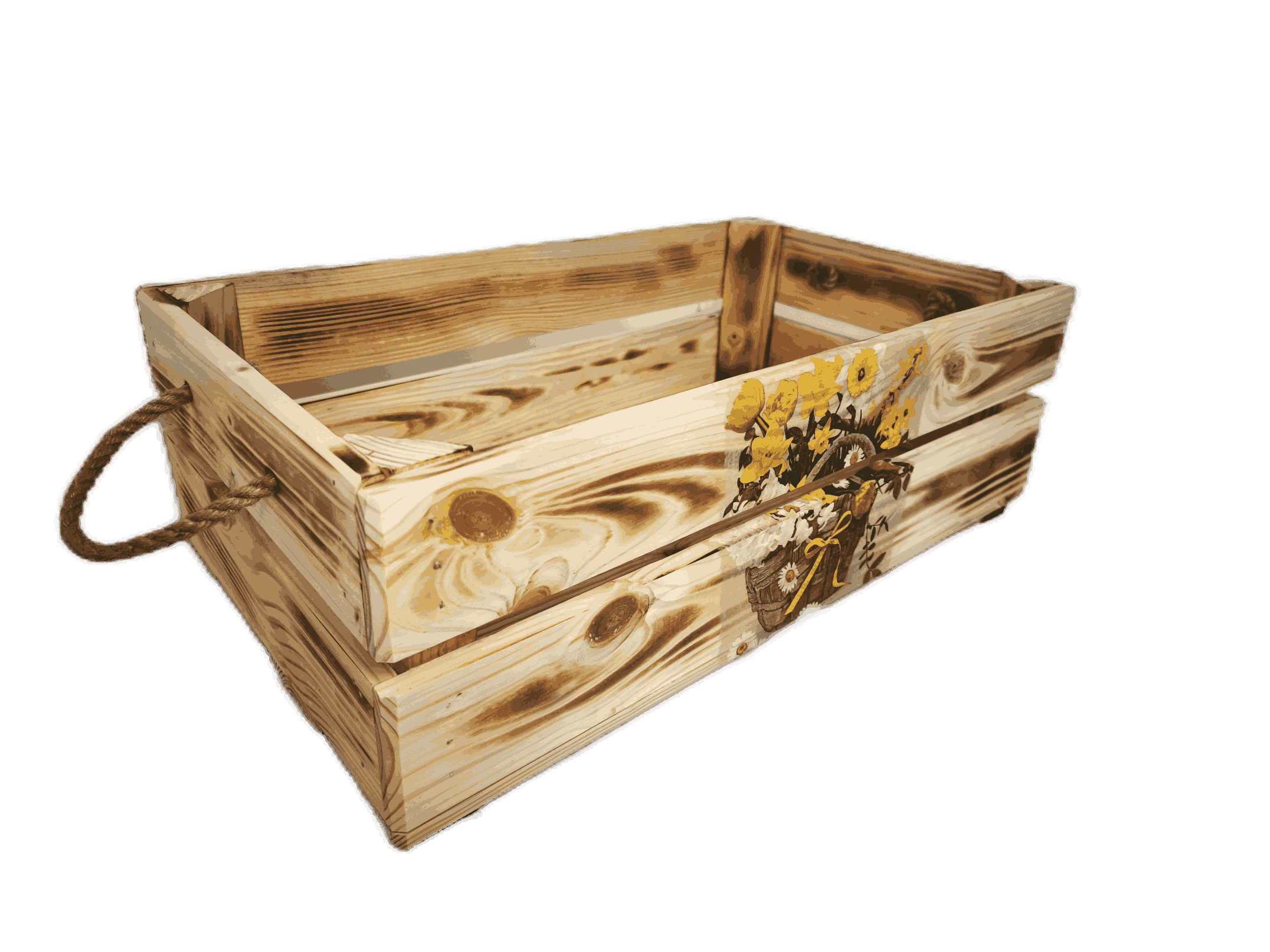 Povrchová úprava: opálené a broušené dřevo, obrázky metodou decupage