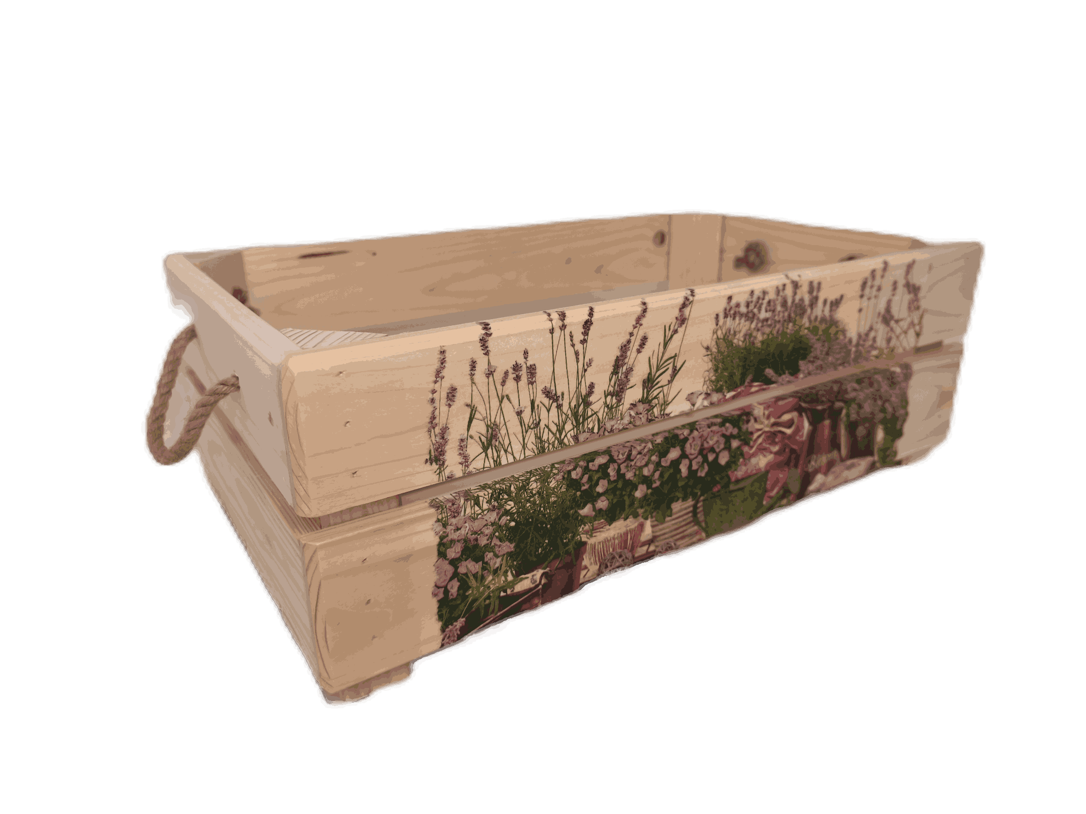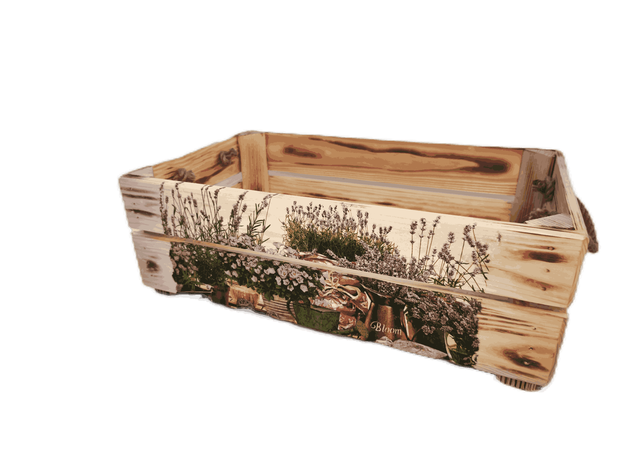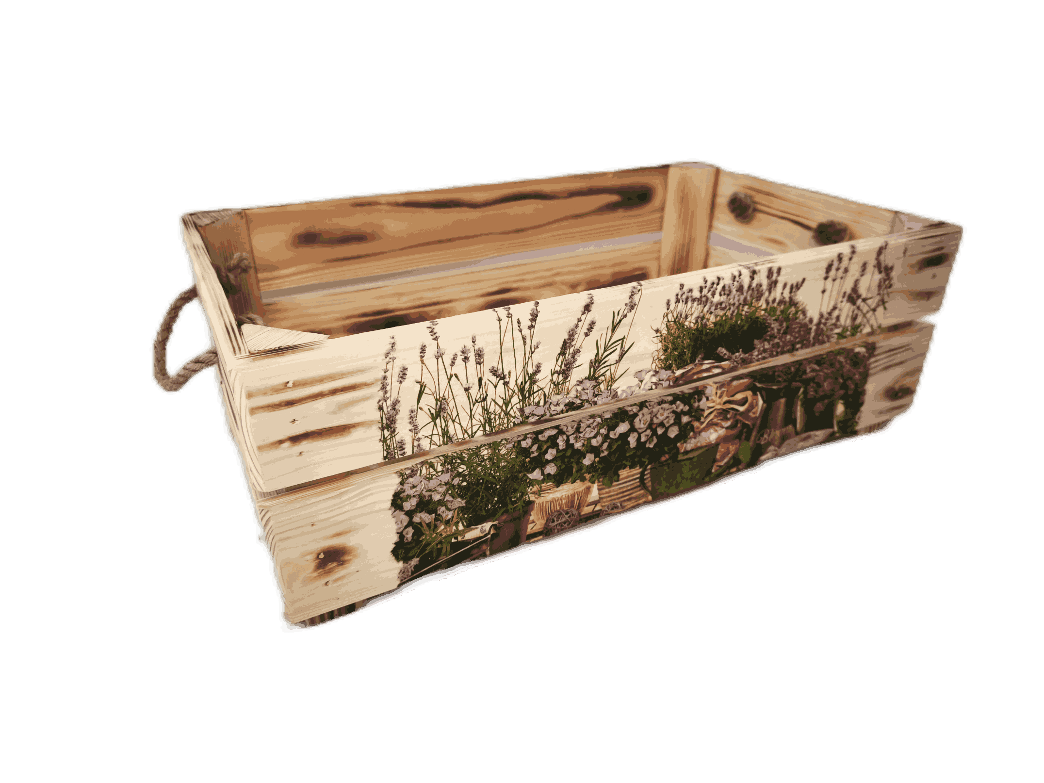 Povrchová úprava: opálené a broušené dřevo, obrázky metodou decupage