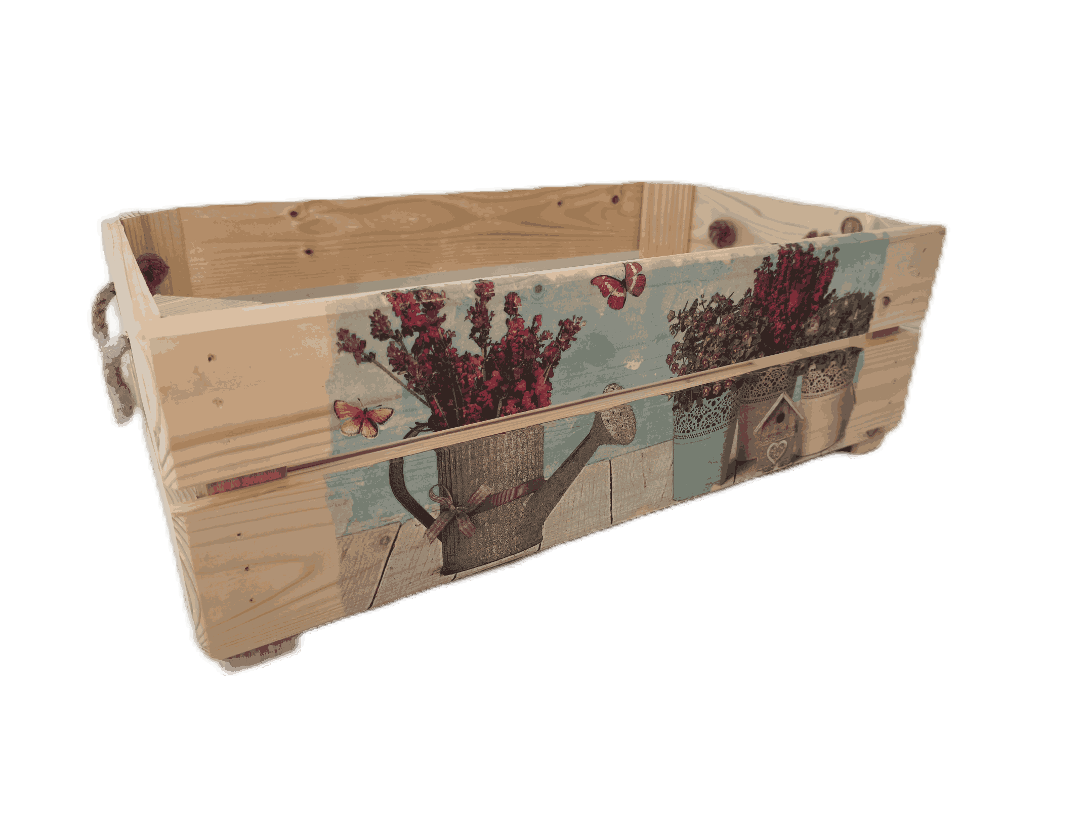 Povrchová úprava: opálené a broušené dřevo, obrázky metodou decupage