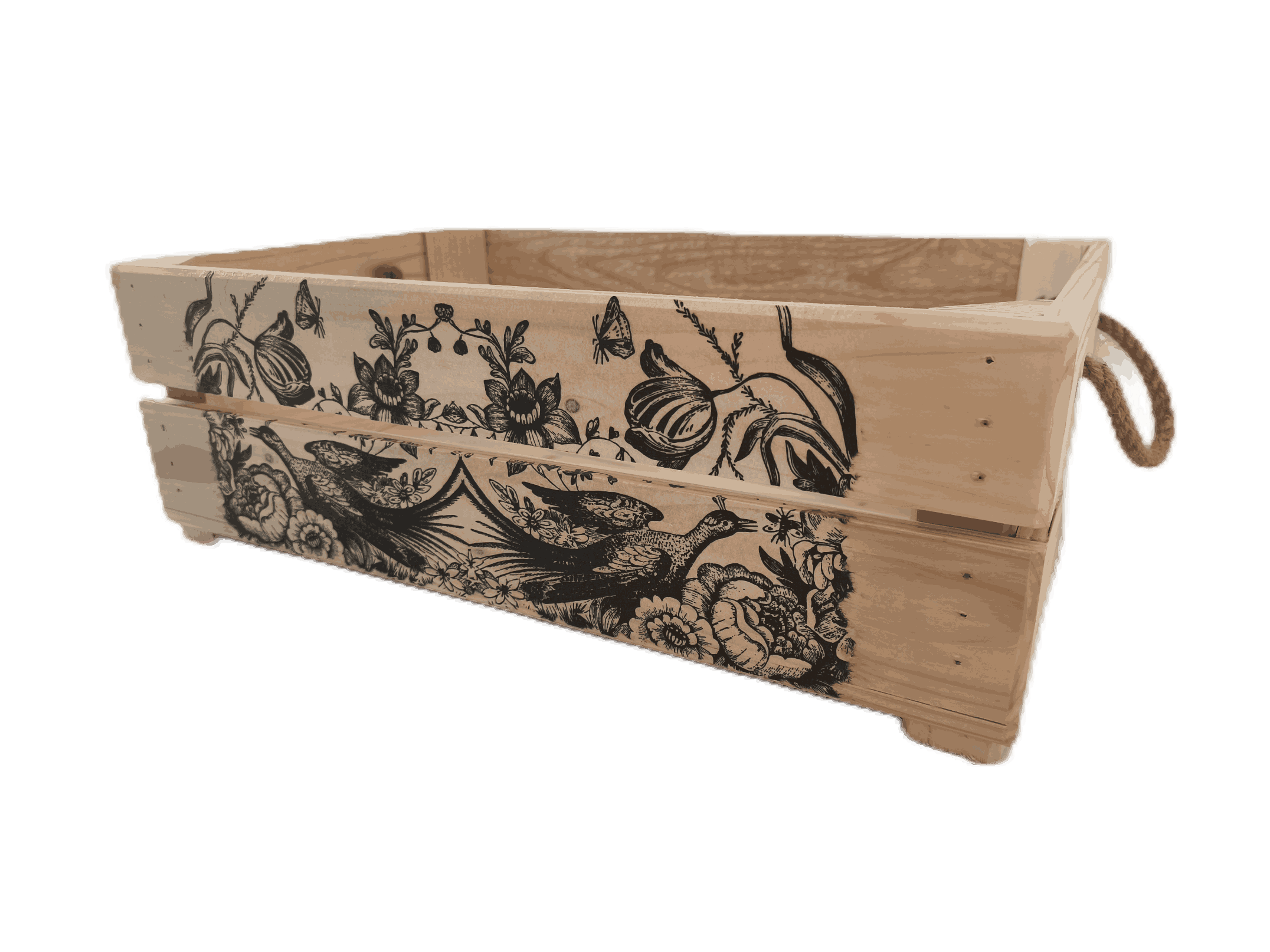 Povrchová úprava: opálené a broušené dřevo, obrázky metodou decupage