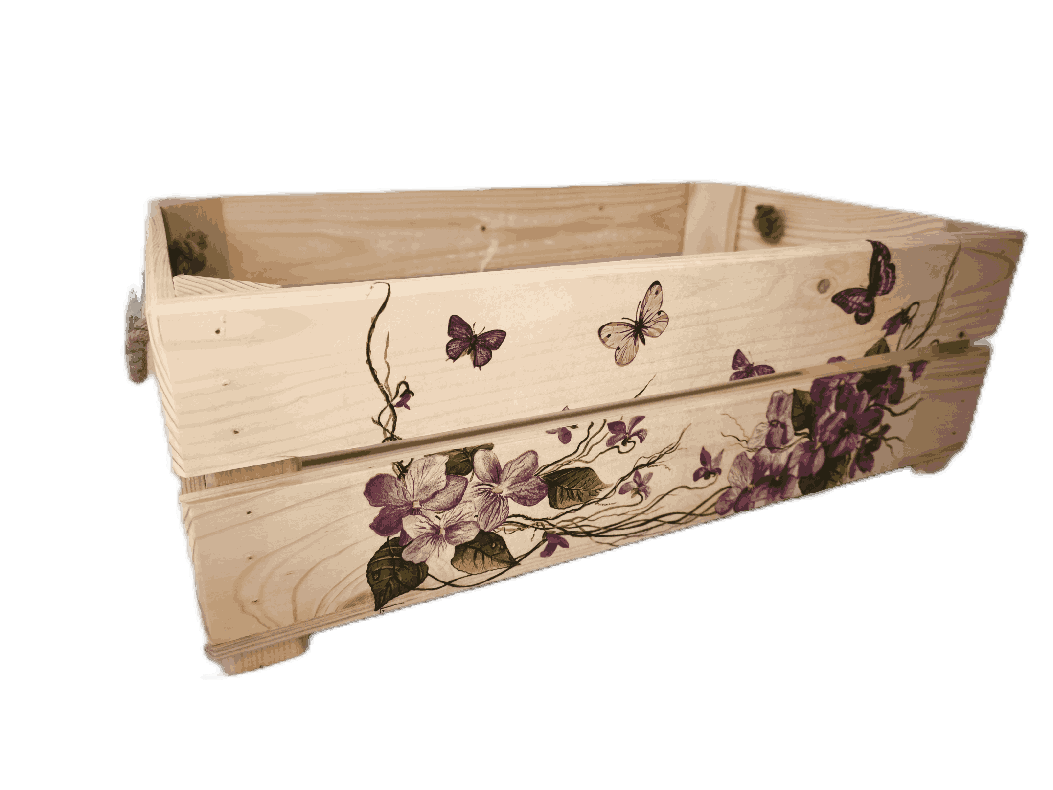 Povrchová úprava: opálené a broušené dřevo, obrázky metodou decupage