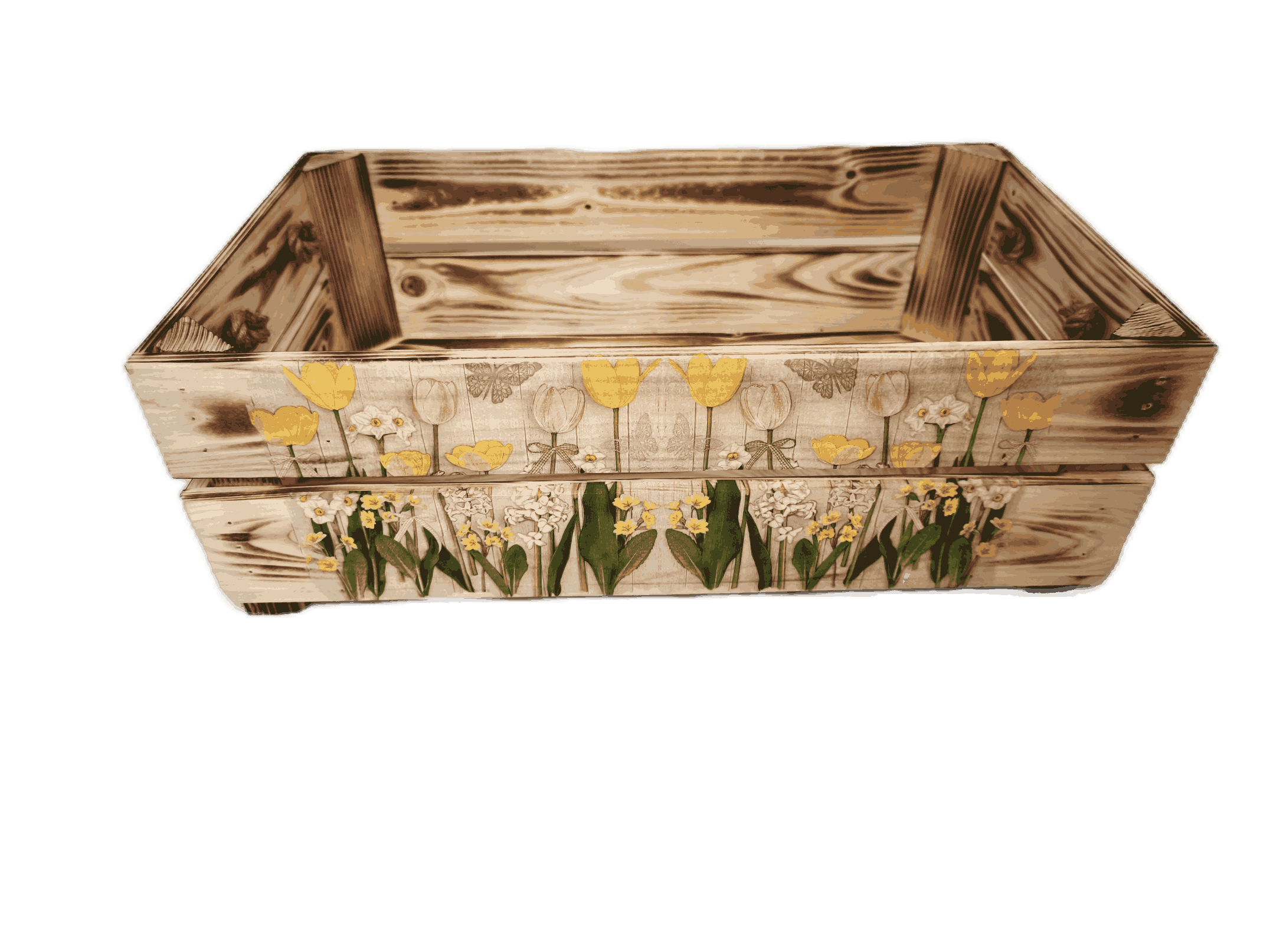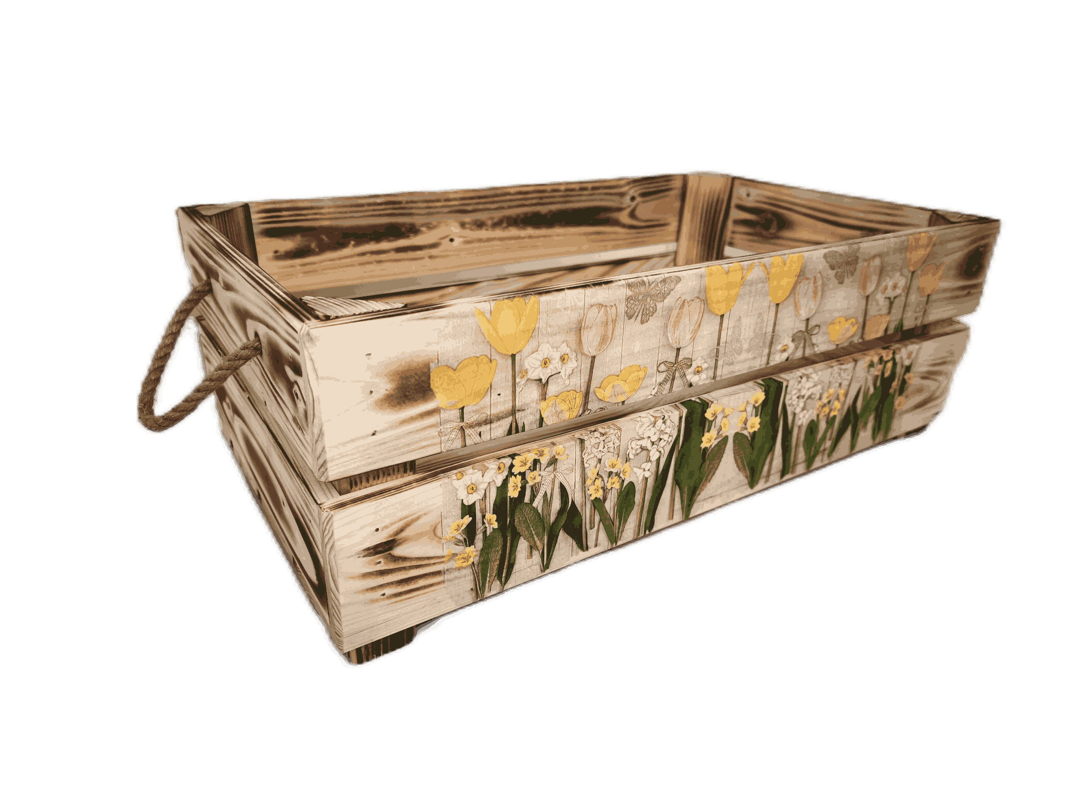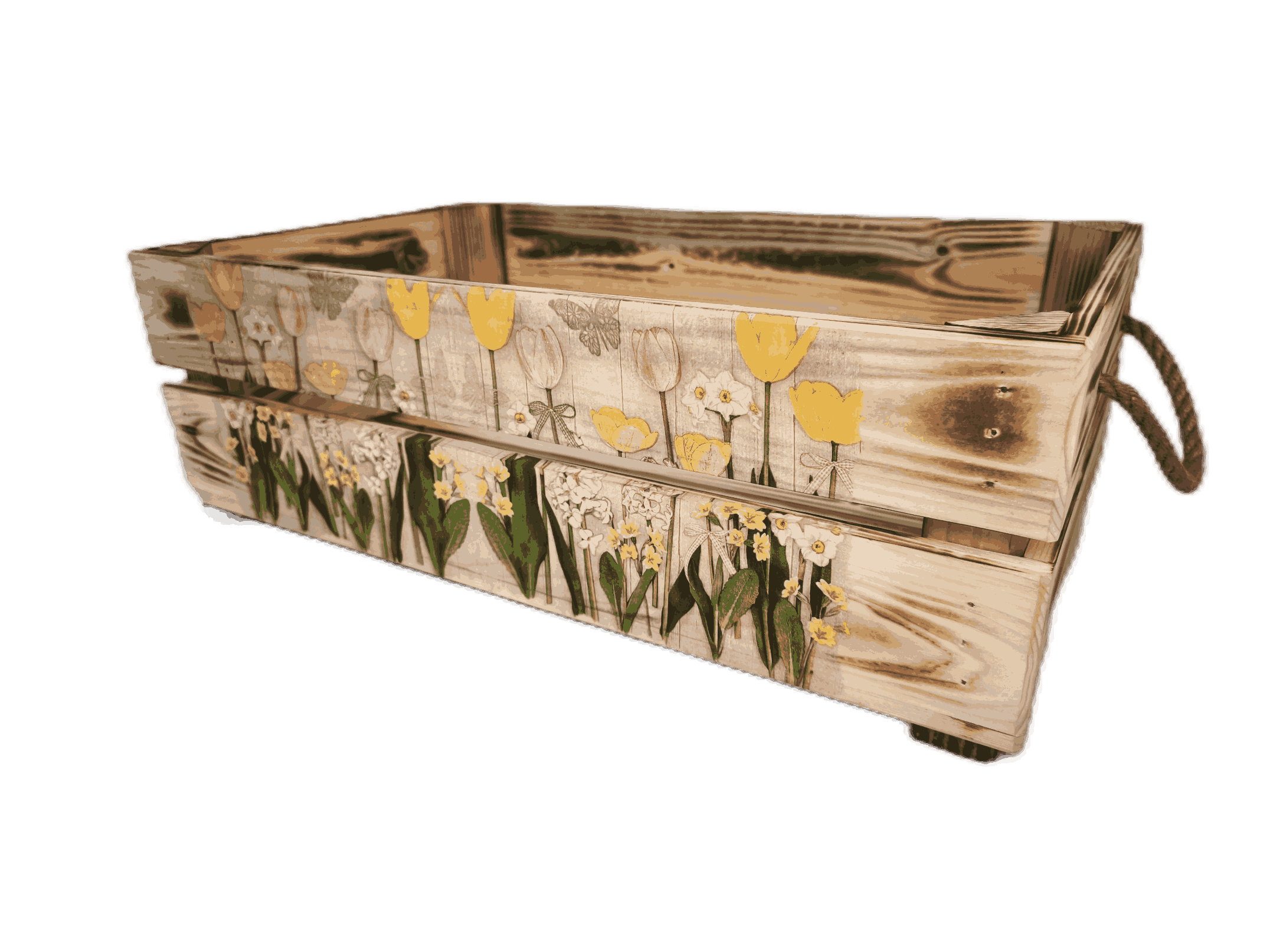 Povrchová úprava: opálené a broušené dřevo, obrázky metodou decupage