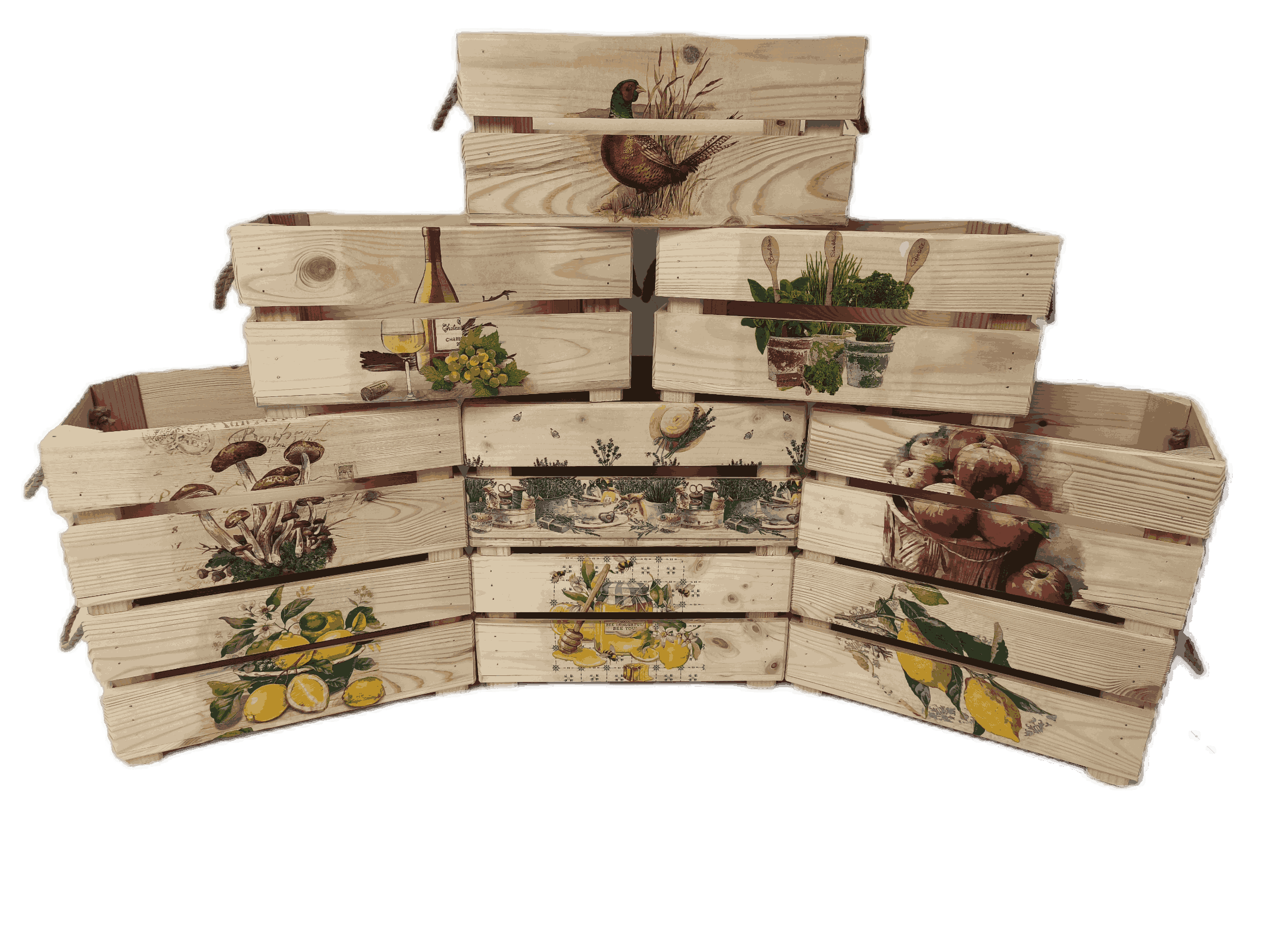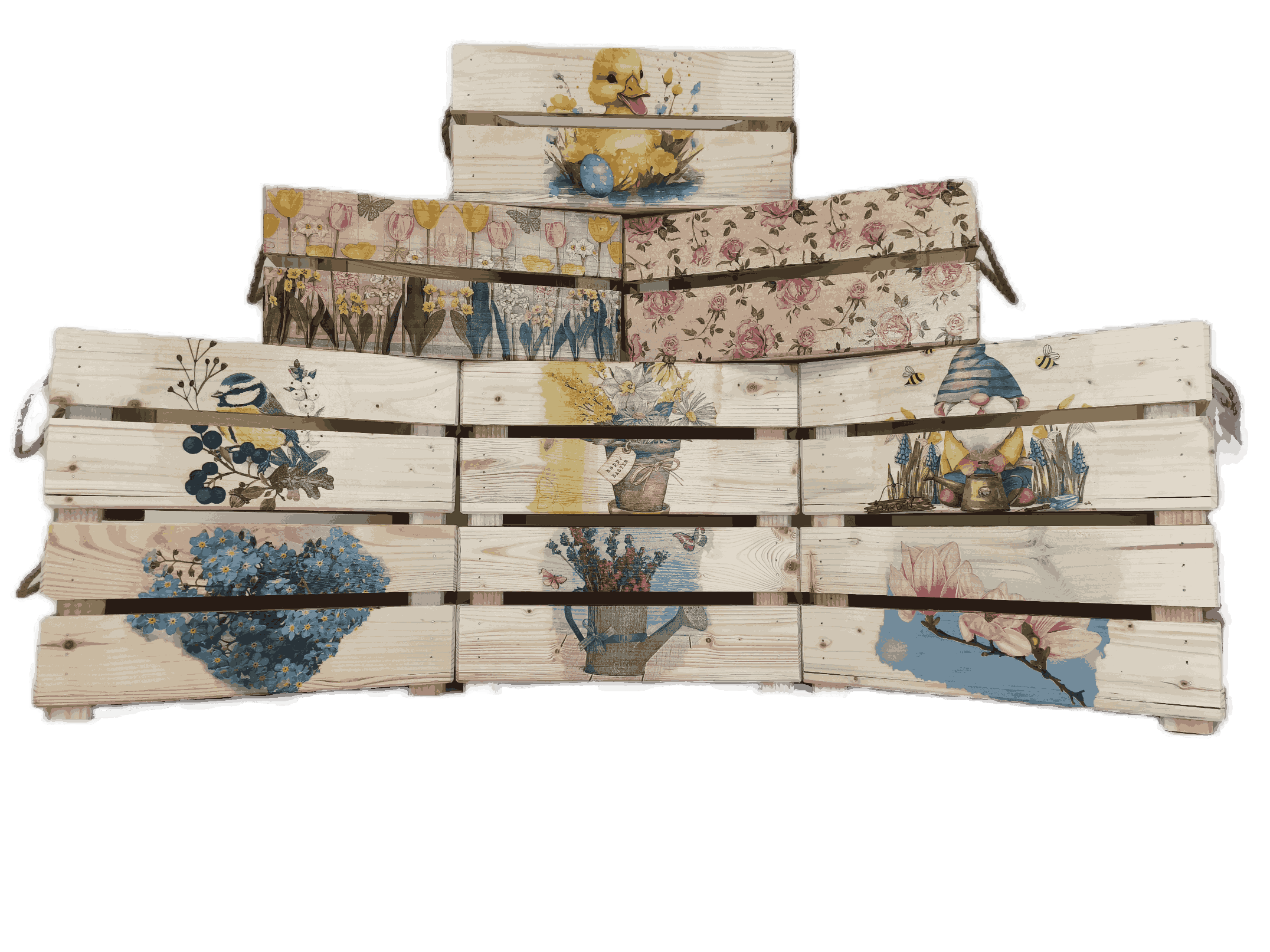 Povrchová úprava: přírodní a broušené dřevo, obrázky metodou decupage