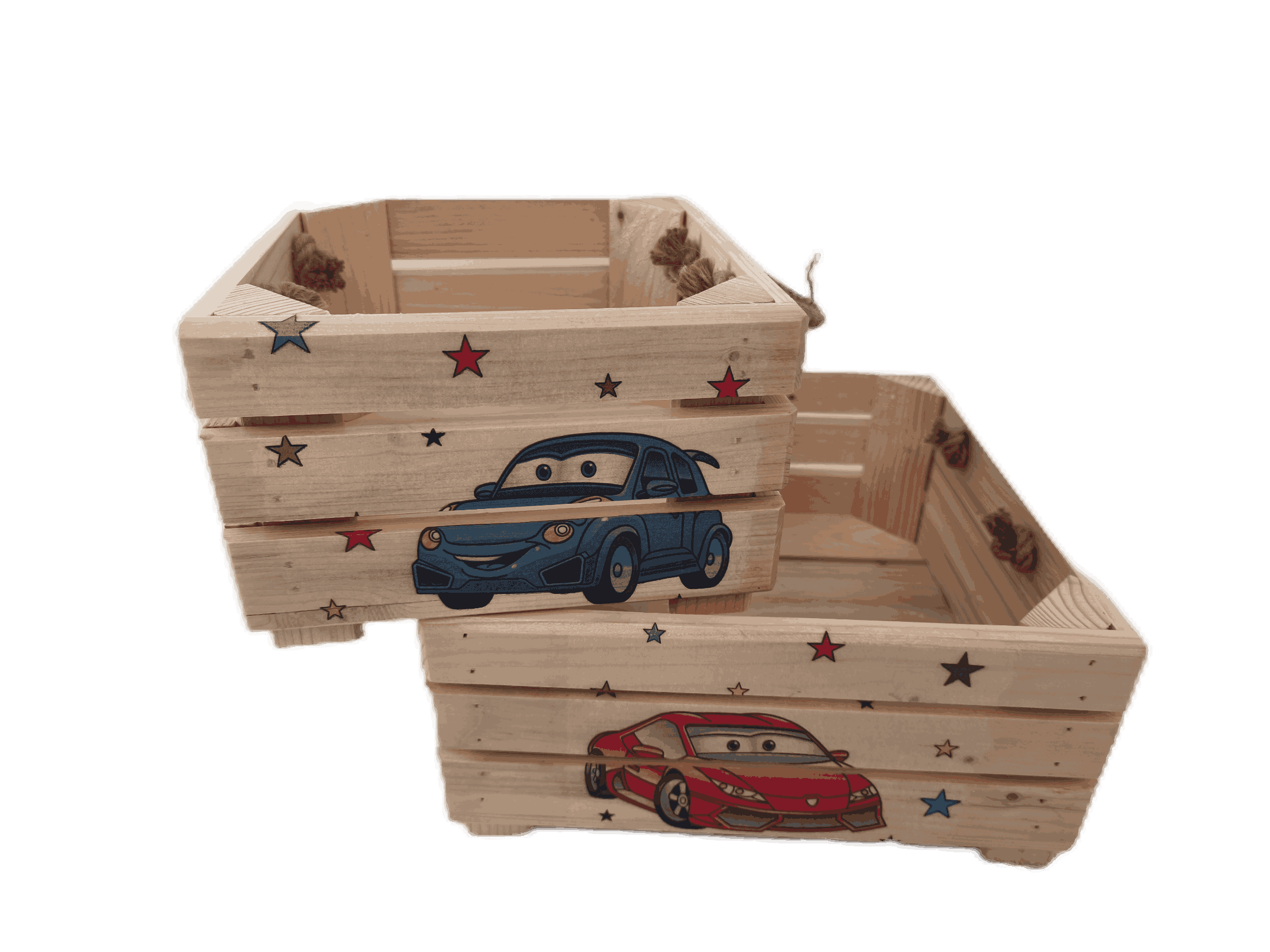 Povrchová úprava: přírodní nebo opalované a broušené dřevo, obrázky metodou decupage s lakovou úpravou