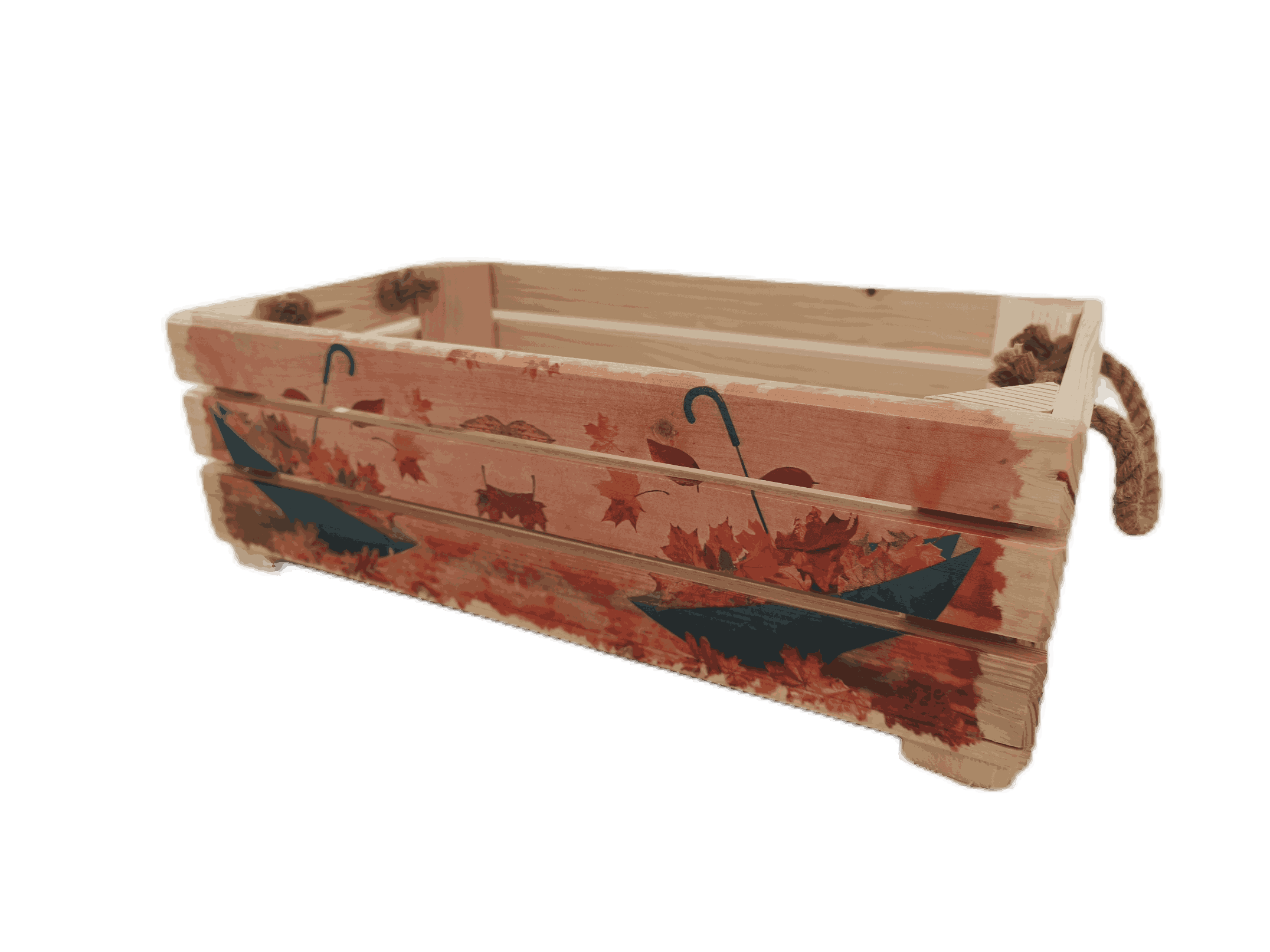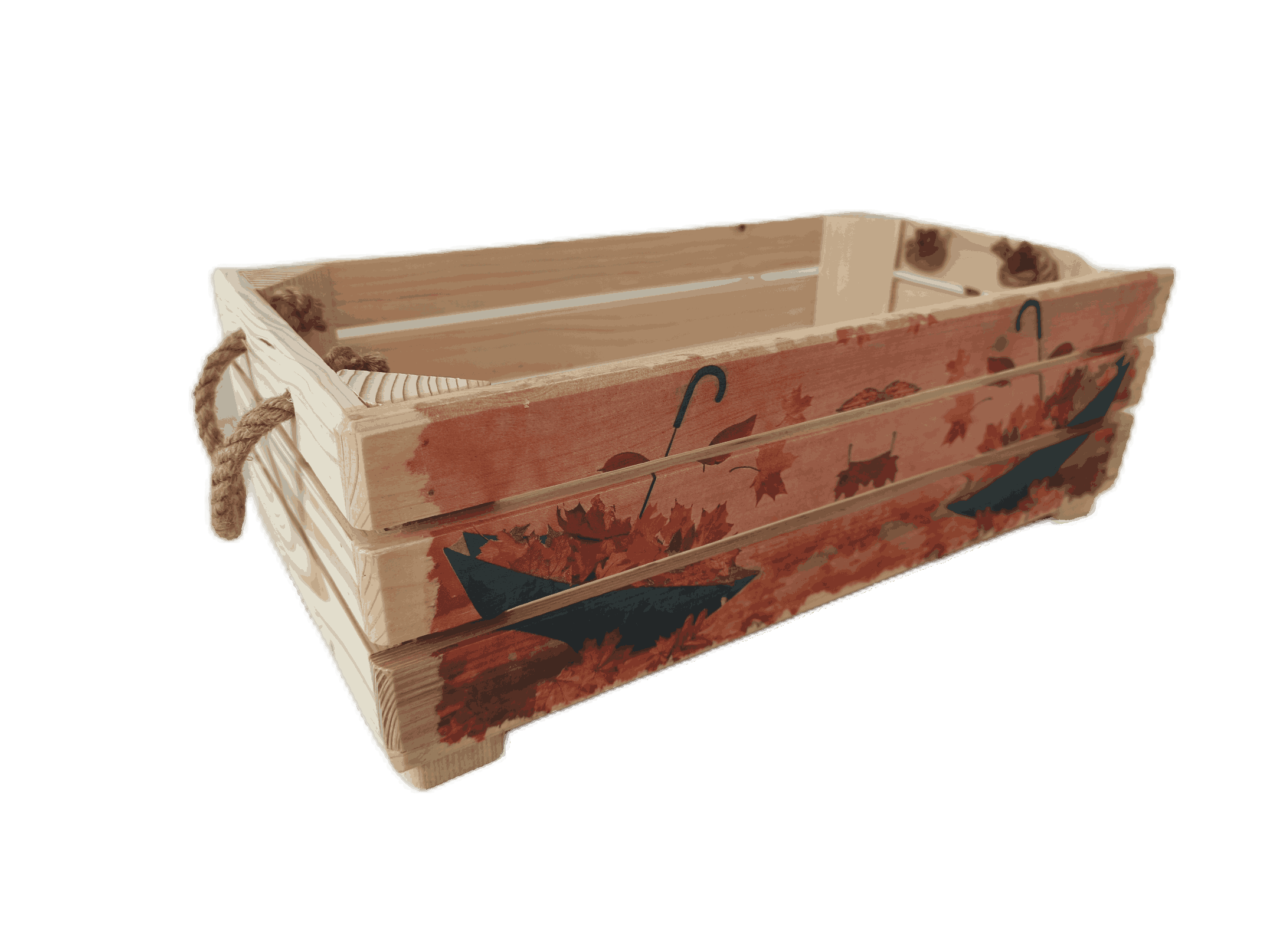 Povrchová úprava: přírodní nebo opalované a broušené dřevo, obrázky metodou decupage s lakovou úpravou