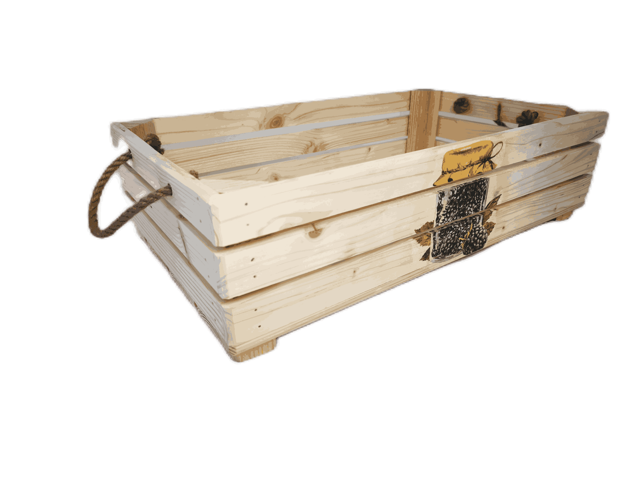 Povrchová úprava: opalované a broušené dřevo, nebo přírodní a broušené dřevo, obrázky metodou decupage