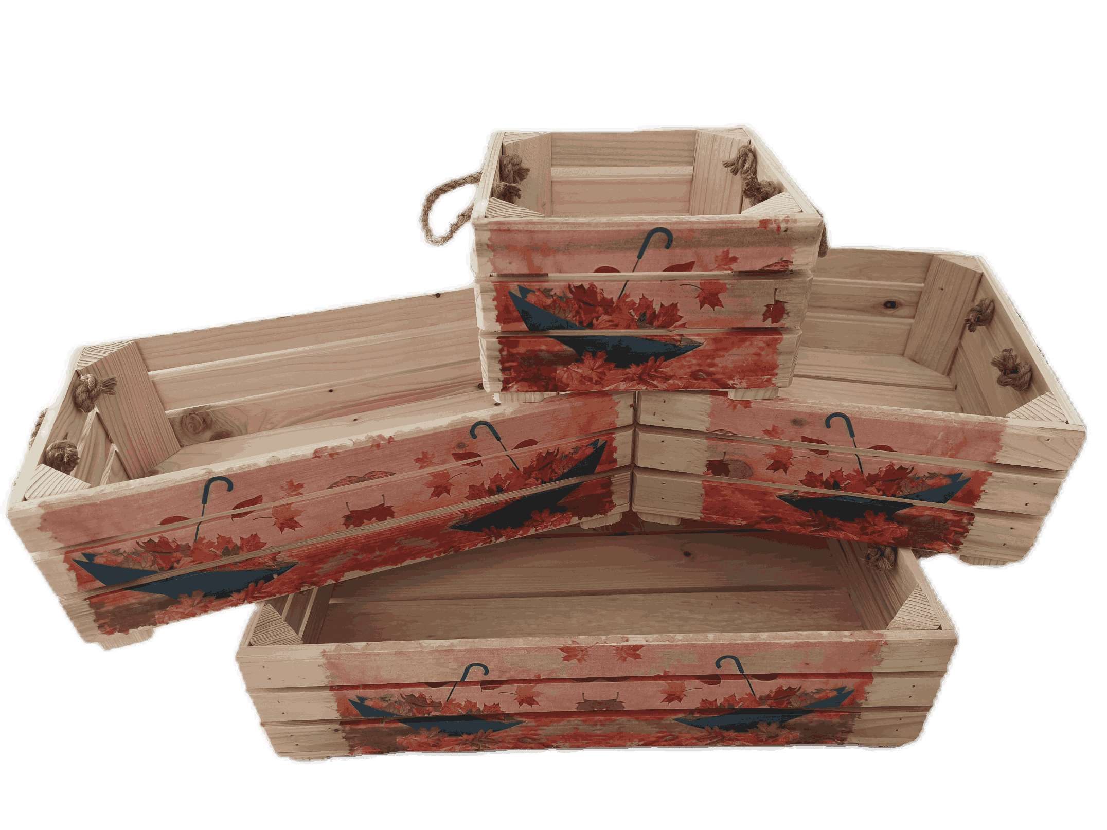 Povrchová úprava: přírodní nebo opalované a broušené dřevo, obrázky metodou decupage s lakovou úpravou