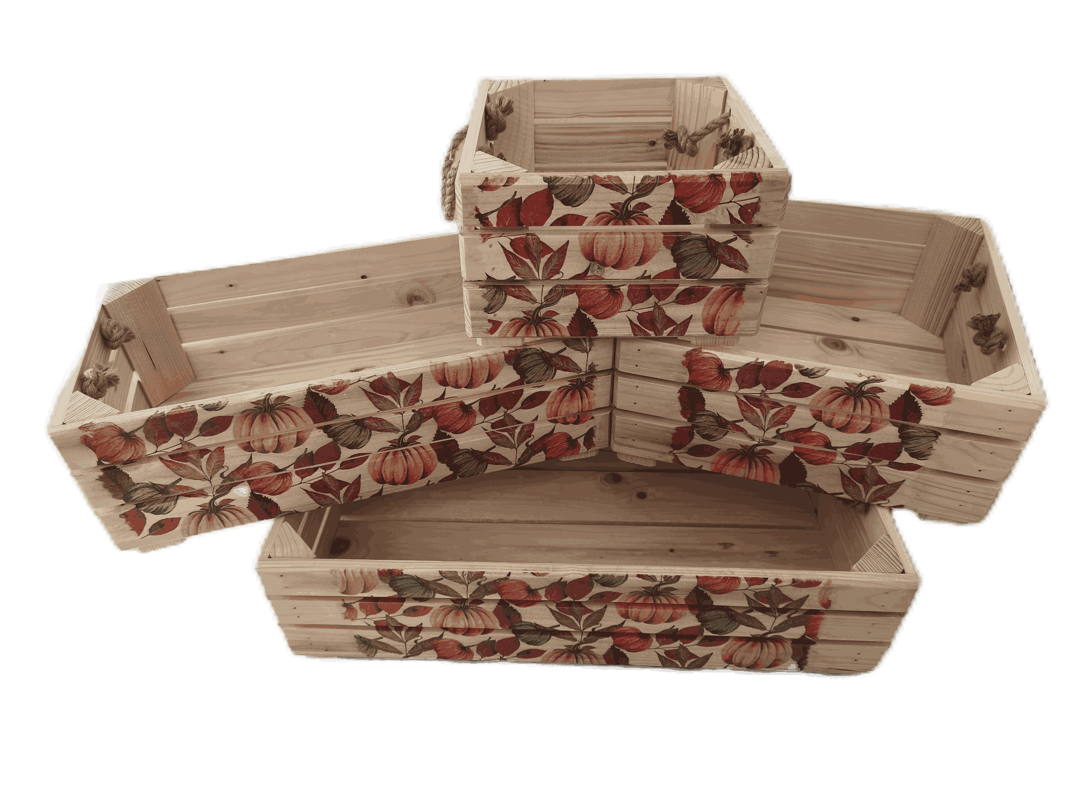 Povrchová úprava: přírodní nebo opalované a broušené dřevo, obrázky metodou decupage s lakovou úpravou