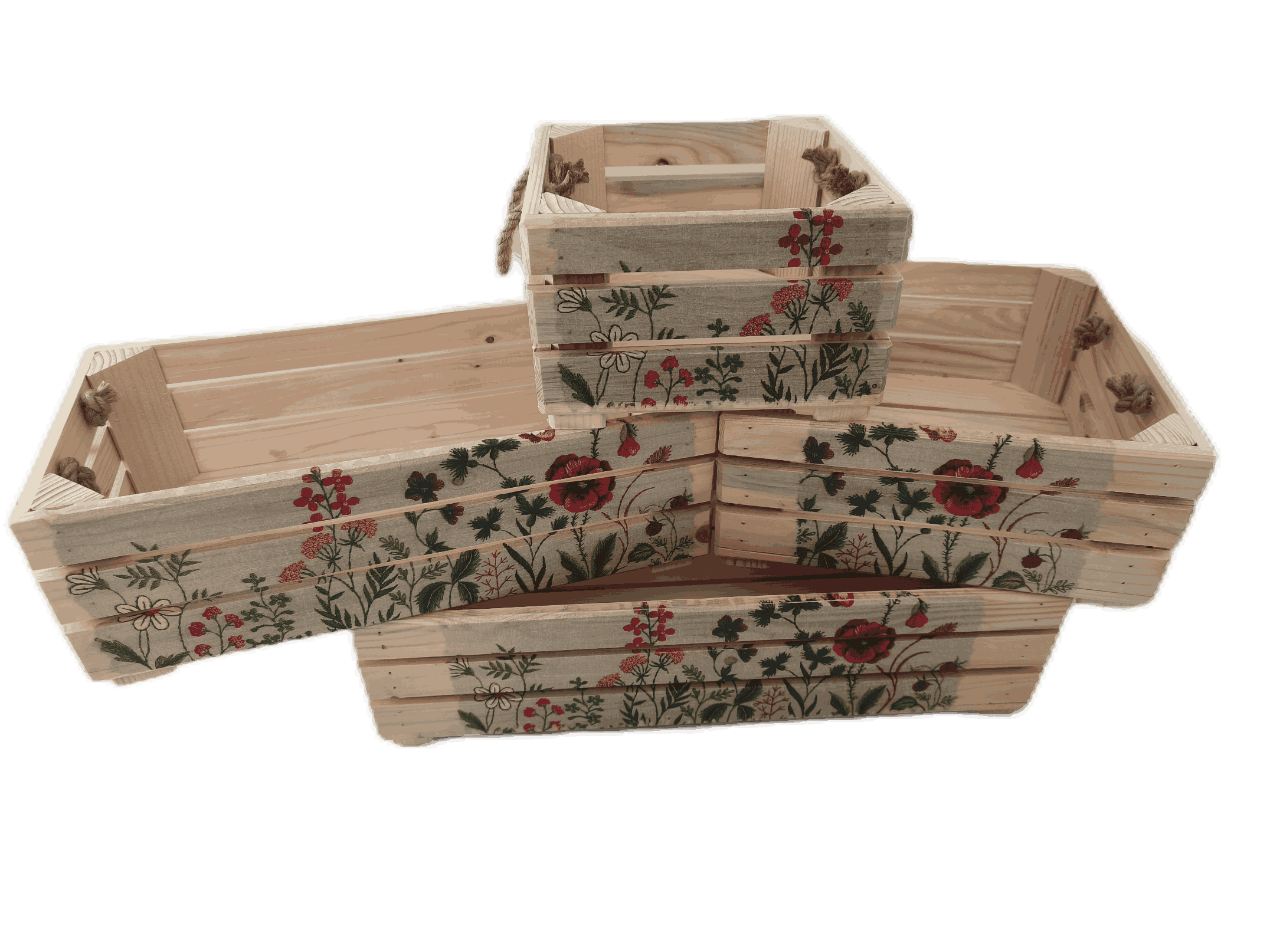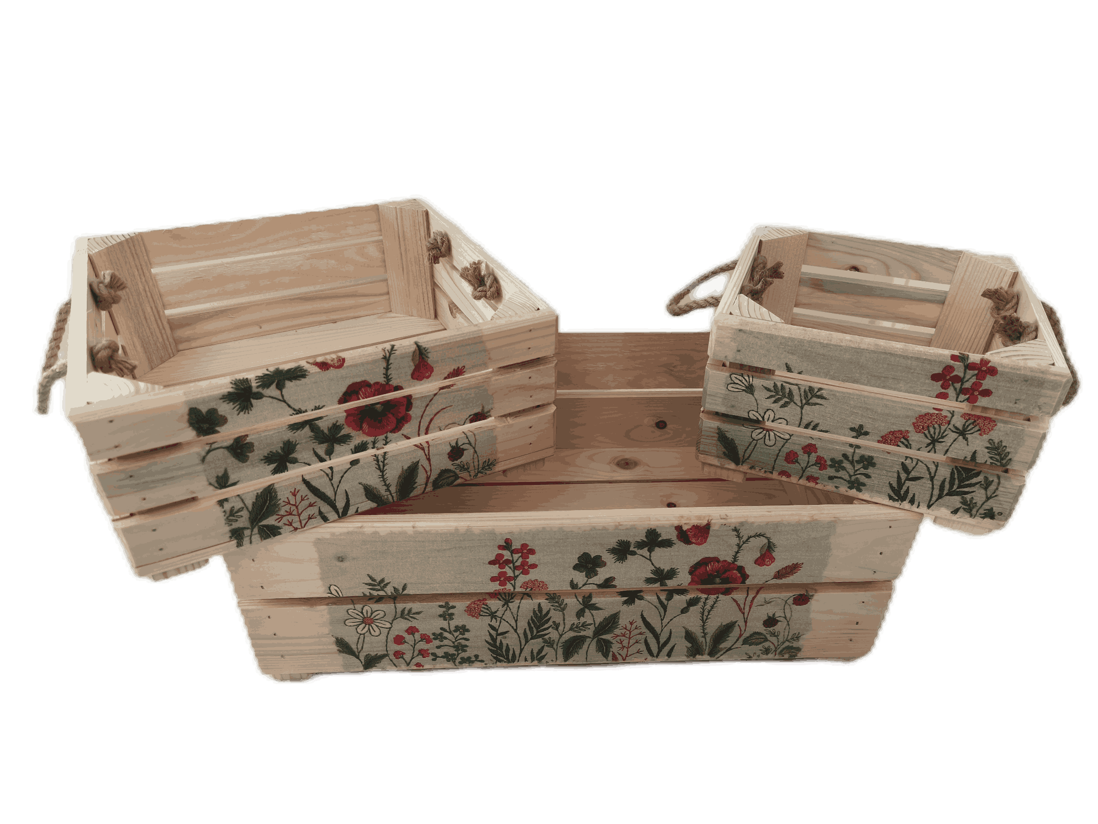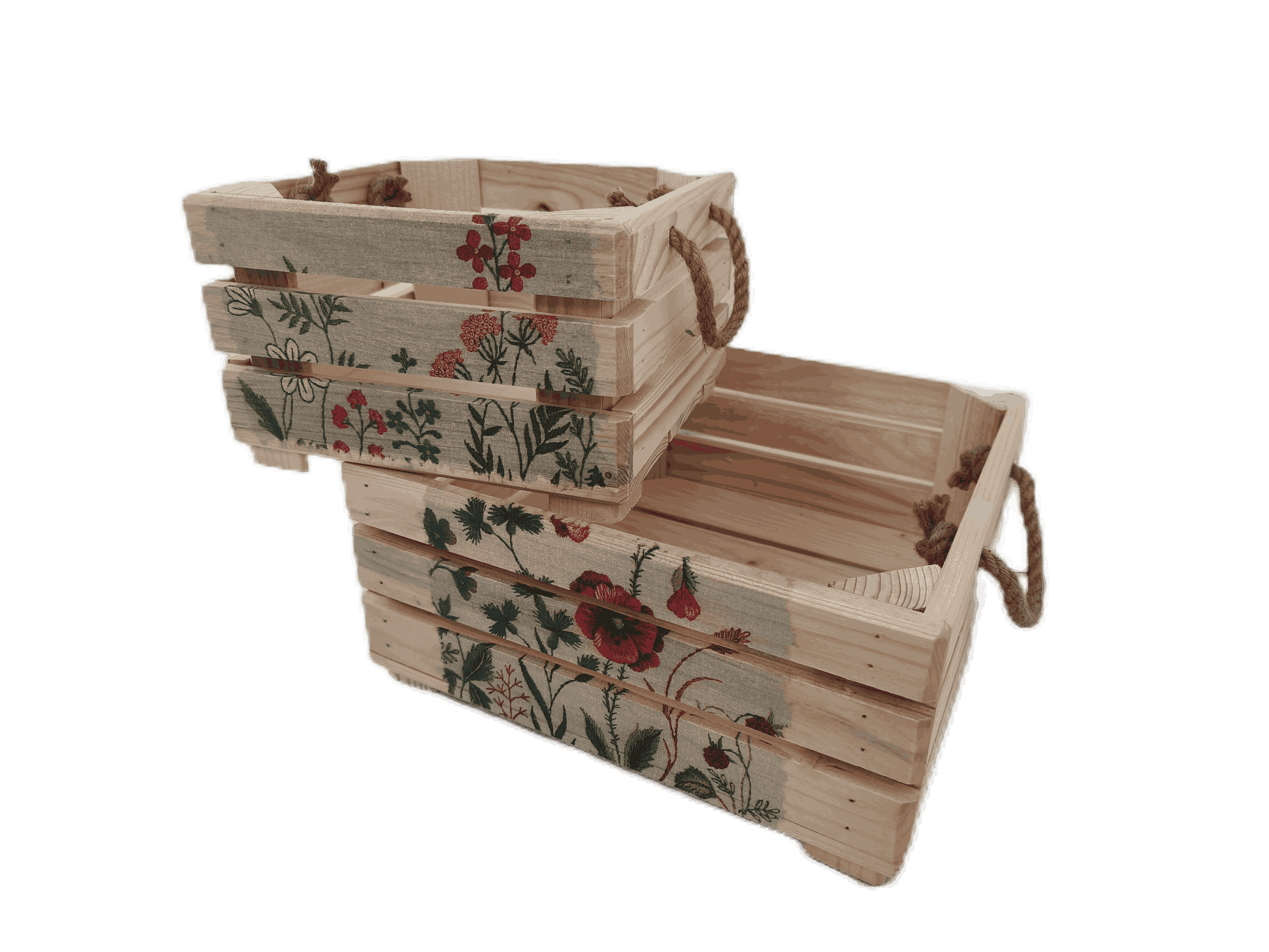Povrchová úprava: přírodní nebo opalované a broušené dřevo, obrázky metodou decupage s lakovou úpravou