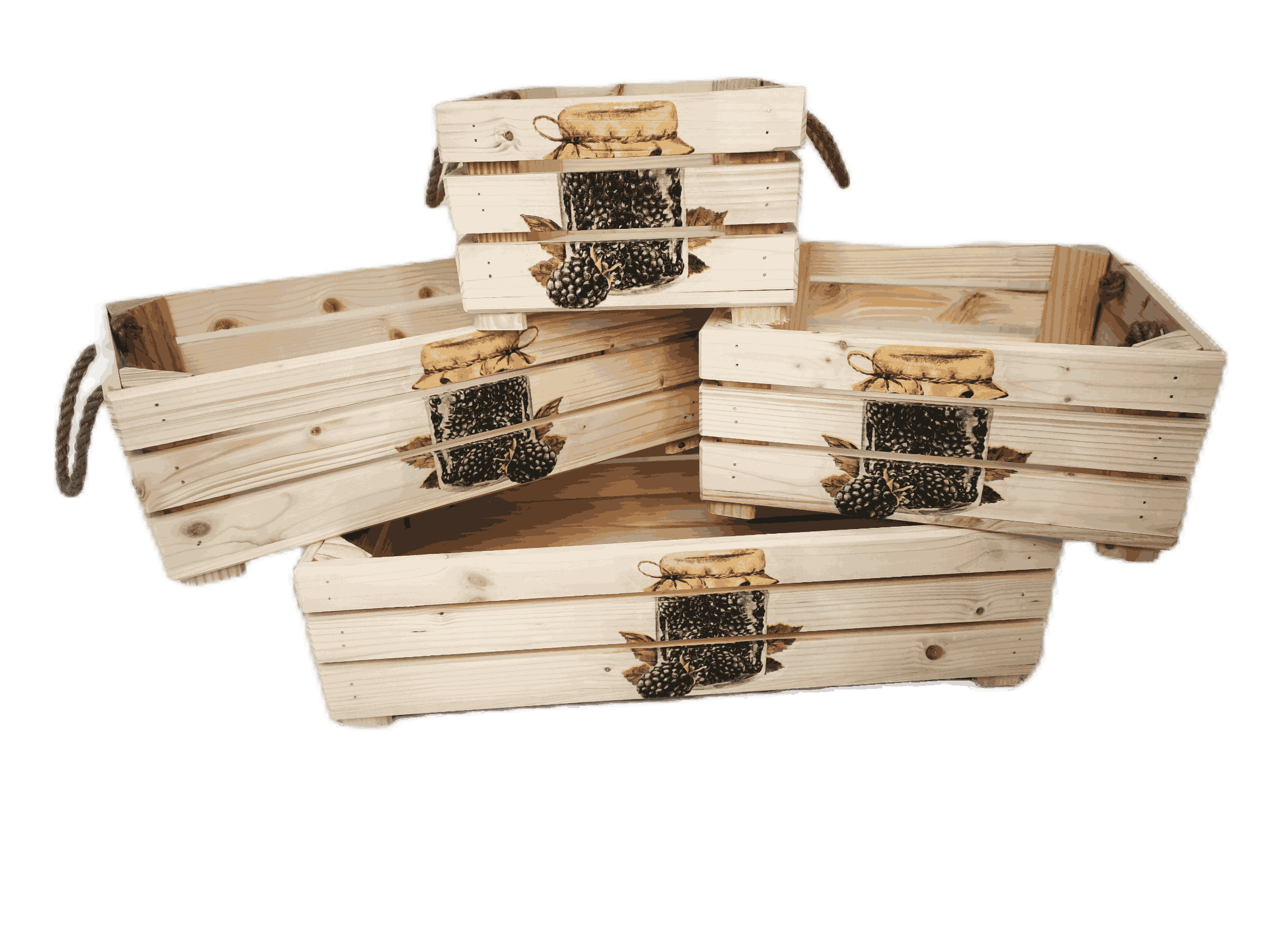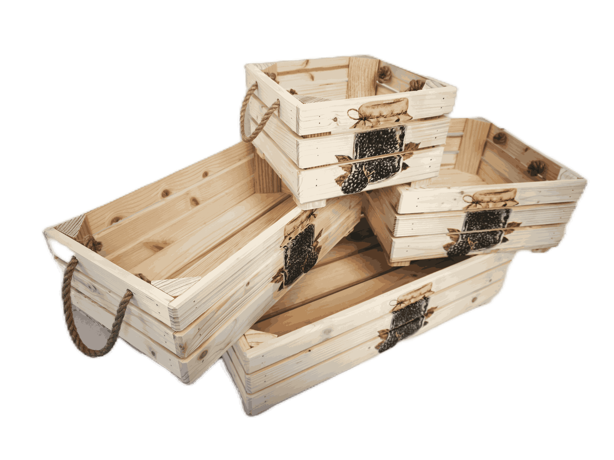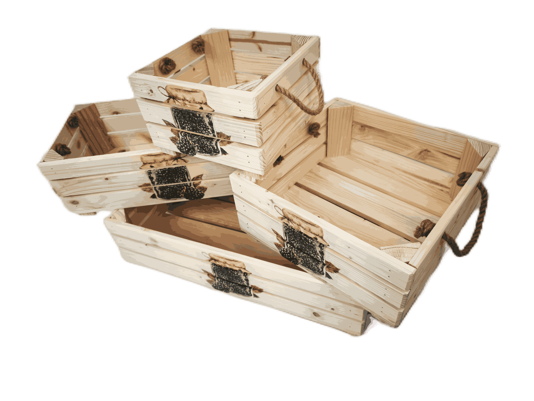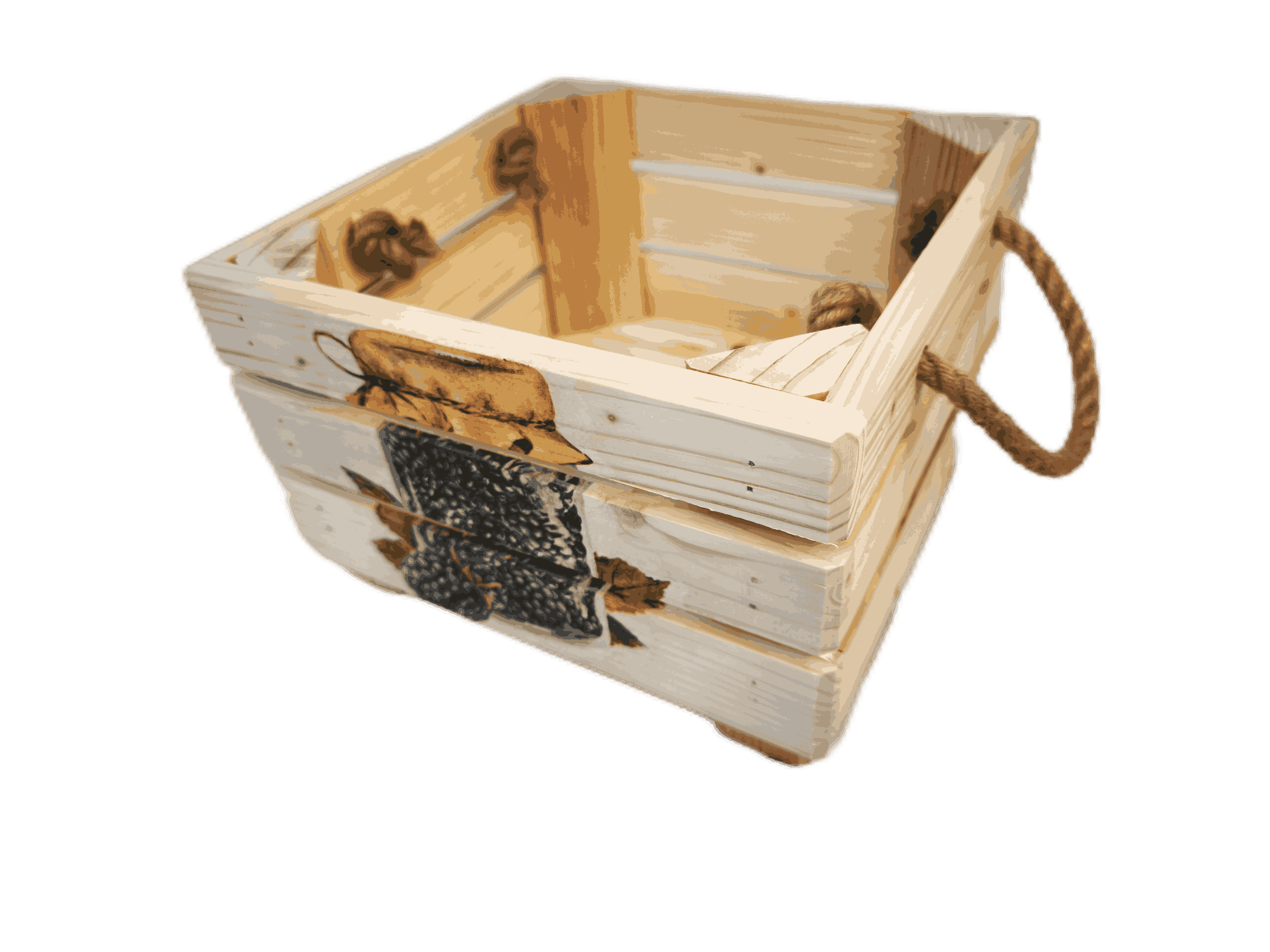 Povrchová úprava: opalované a broušené dřevo, nebo přírodní a broušené dřevo, obrázky metodou decupage